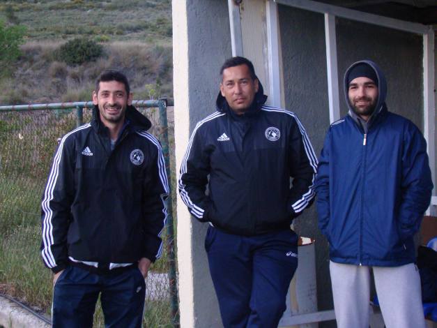 Thanos (the U-13 coach), Tzitzi (the goalkeeper coach) and Stratos (our doctor) )